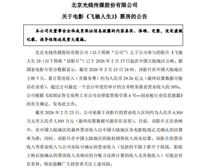 问题在于,《飞驰人生3》有9家出品方和16家联合出品方,属于“僧多粥少”的状态,这一点联合出品方之一的光线传媒,在公告里提及了。当《飞驰人生3》票房29.2亿时,公司来源于该影片的营业收入区间约为人民币4300万至5300万,如果扣掉此前参与投资的成本,估计也赚不到多少。后续票房再增加才会有更多收入。但相比30亿票房,5000万左右的营业收入真不算高。