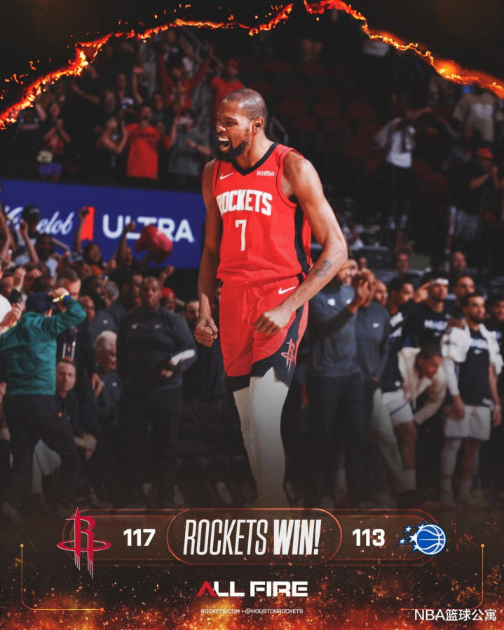 史密斯大帽席尔瓦,杜兰特单打命中,比赛仅剩9.1秒,魔术落后3分并请求暂停。小瓦格纳2罚全中,休斯顿请求暂停。谢泼德2罚全中,小卡特2罚1中,第二罚魔术队提前进线。阿门2罚全中,贝恩超远三分球不中,比赛时间走完。最终,火箭以117比113险胜魔术,上演了14分逆转好戏。