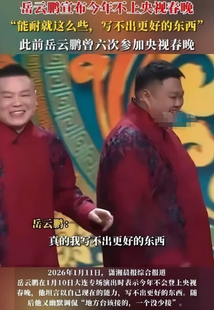 岳云鹏的退出方式很特别,他是在自己的演出中主动向观众透露不会上春晚的消息。